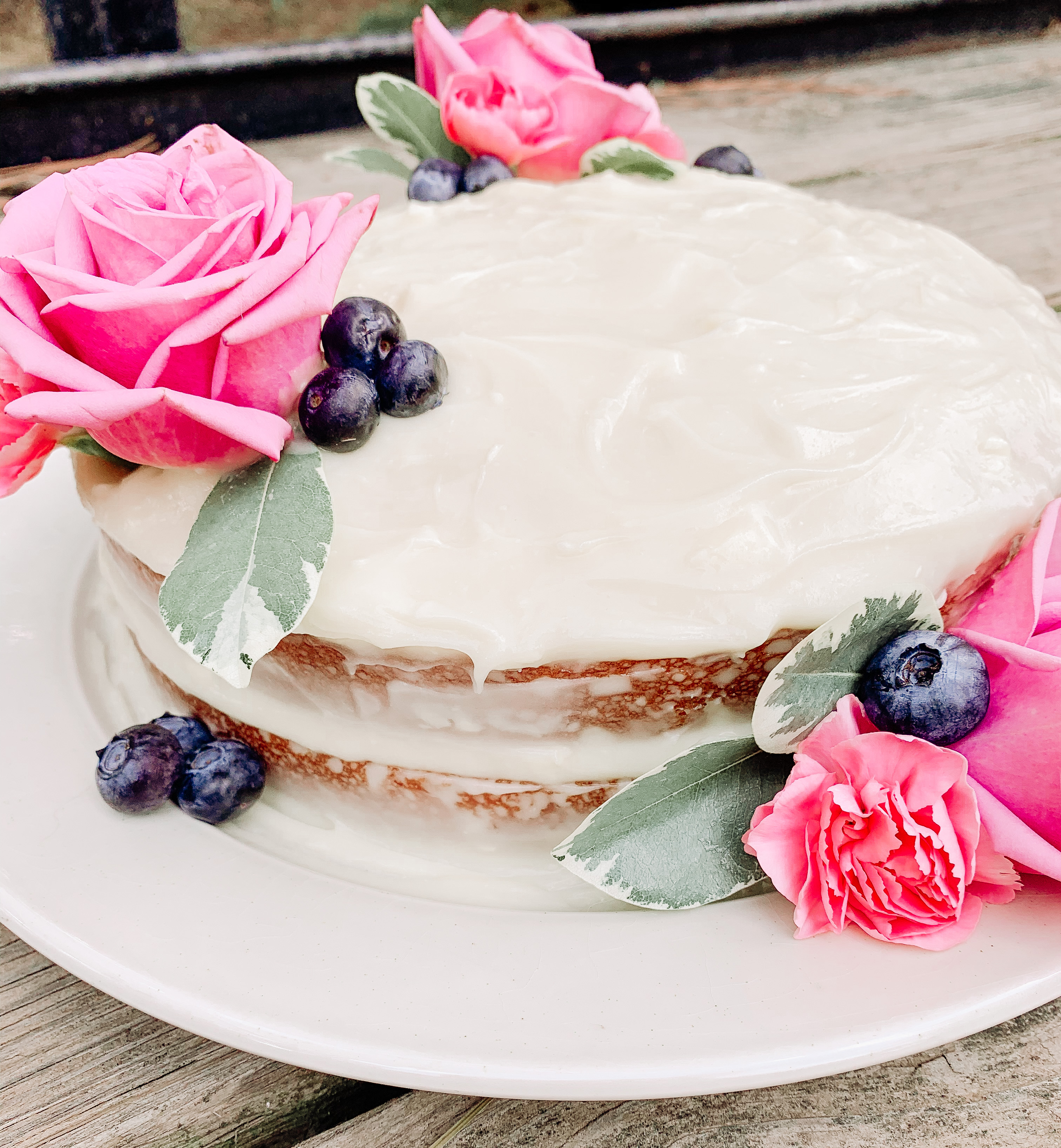 For the flowers, I went out and bought an assortment of pretty, real flowers and greenery from the local grocery, chose and cut the ones that looked the best, and arranged them on the cake. That simple! I added a few blueberries just for fun, but you can use any kind of berry in its place.
